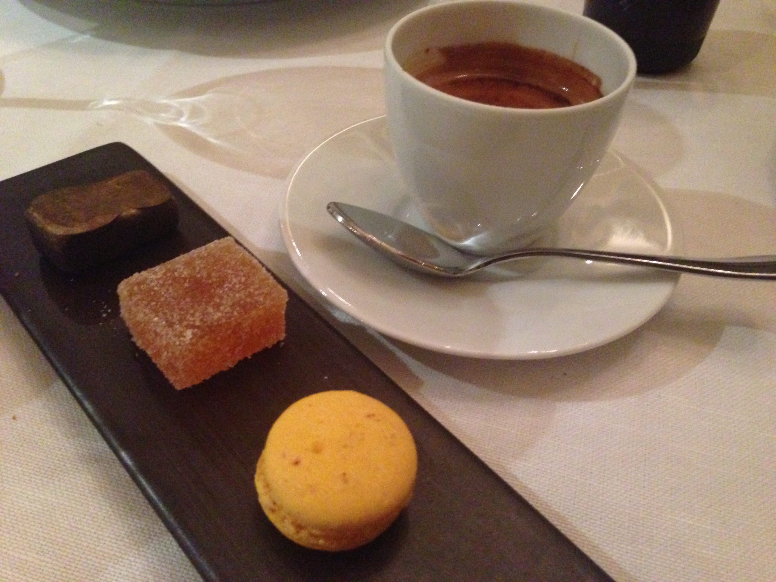 After lively chatter commenting on the new still life paintings that currently adorn the Estate Grill walls (for details of current exhibition go to Life – The Gallery) we turned to the important decision of pudding. The cheese selection was, frankly, awesome. We tried some May Hill Green – a wonderfully, sticky sister cheese to Stinking Bishop, accompanied by fig chutney and a rather wonderful glass of 20 year old William Pickering Port, before indulging in desert. White Chocolate and Coffee, Green Tea and Sesame held a secret (no we’re not telling!). The Rhubarb as featured in the main picture was a wonderful collection of textures and the Petits Fours served with Mozzo Coffee or Jing Tea were adorable.