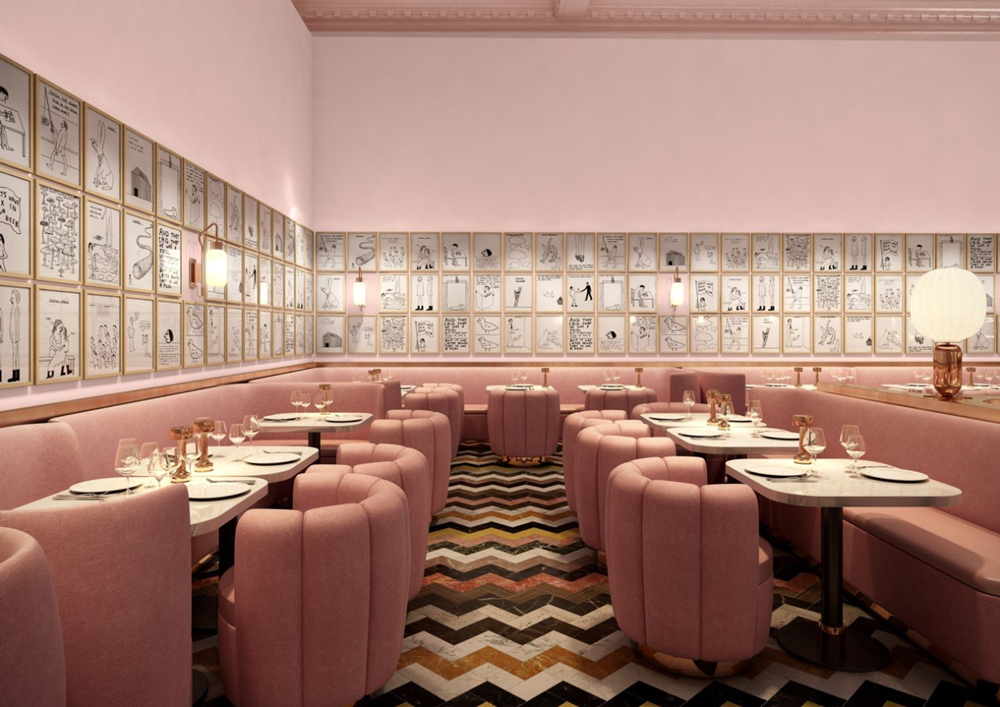 The new restaurant opens this Friday so this was a sneak preview of David Shrigley’s interpretation of the space. The room, a large exhibition room, has been deftly re-arranged from the eclectic-crazy-fun mix of having every chair, plate, table different to a smooth grown-up pastel affair. Flattering lighting, tonal colours pinks and gold and custom-made furnishings by India Mahdabi the Iranian-French designer and delicious smells by Diptyque have created a great canvas that brilliantly collide with the 239 original drawings of 45 year old British born, Turner nominated Shrigley that adorn the walls. Everything is up for sale – the jugs, plates, salt cellars, pictures and all black and white, comedic, simplistic and with a story-to-tell to the observer.